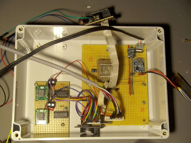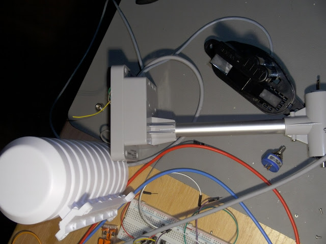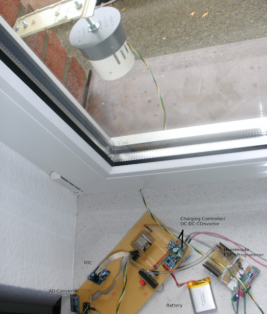 Der ESP wird via deepSleep in den Tiefschlaf versetzt und wacht alle 20 min auf, um Messwerte einzuholen. Ein NPN Transistor dient dazu, dann auch die anderen Busteilnehmer (BMP280, 2x PCF für Regen und Wind 2x ADC und die RTC) zu aktivieren. Die RTC wird genutzt, um die Windgeschwindigkeit zu errechnen. Die Zeit wird zu Startbeginn des ESP abgefragt, und über die Laufzeit des ESP und die gezählten Umdrehungen des Anemometers wird die Windgeschwindigkeit berechnet. Der AtMega ist nicht mehr Bestandteil der Wetterstation, da dieser zum "Schlafen-legen" des ESP gedacht war, sich mit dem deepSleep-Modus allerdings genug Energie einsparen lässt.